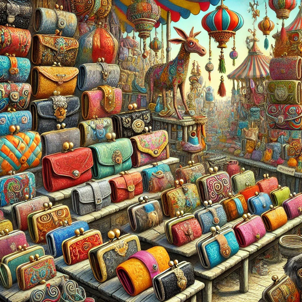 Thousands of wallets of all shapes and sizes lay on the counters: some as small as matchboxes, others so huge you could hide a goat in them. They sparkled with clasps and shimmered with leather, and each merchant proudly shouted: